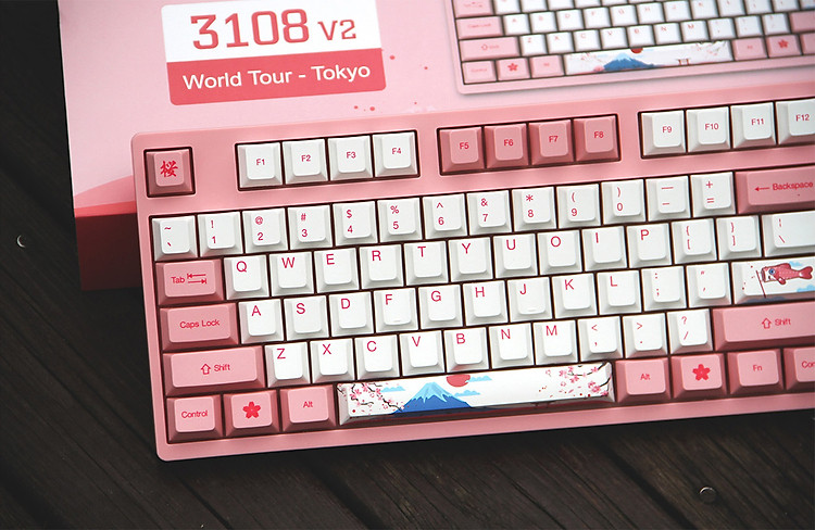 Akko 3108 V2 World Tour Tokyo lấy màu chủ đạo là màu hồng và trắng. Với nhiều kiểu dáng đẹp mắt cùng bộ keycaps cực “thời trang”. Cùng những hình ảnh biểu tượng của đất nước mặt trời mọc như hoa anh đào, núi Phú sĩ, cá chép và mèo may mắn Maneki Neko (biểu tượng của Nhật Bản). Sử dụng một số thành phố nổi tiếng trên thế giới làm nguồn cảm hứng thiết kế. Kết hợp với các đặc điểm văn hóa địa phương AKKO 3108 World Tour không đơn giản là một sản phẩm bàn phím. Nó là một sự chuyển giao văn hóa và tạo ra một khái niệm văn hóa bàn phím hoàn toàn khác. Đây chắc chắn sẽ là 1 mẫu bàn phím rất “hot” với các bạn nữ vì độ “cute” bung nóc.
